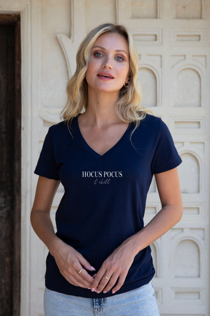 Spooky season is upon us! It's our comfortable and flattering v-tee with a nod to the changing seasons. Relaxed yet pretty, this design has been cut from pure organic cotton in comfortable jersey. Endlessly useful, this staple T-shirt is the perfect addition to wardrobes.