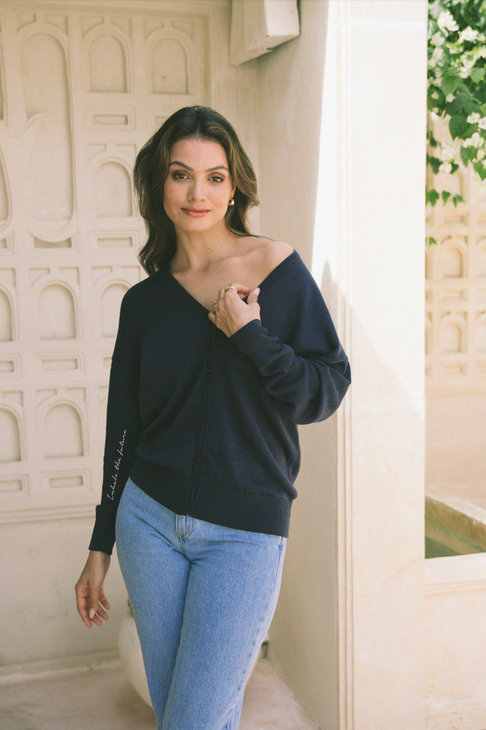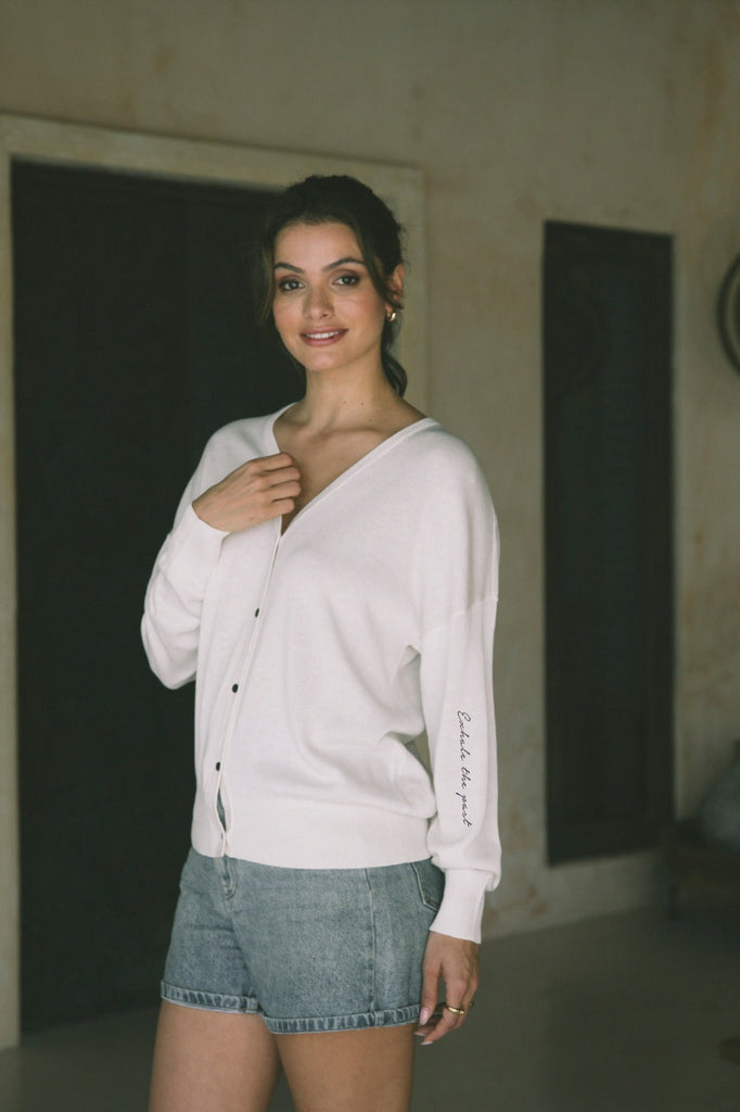 Our Inhale Exhale V-Neck Riviera Cardigan is the most elegant addition to your wardrobe. This knit is lightweight, understated and crafted with drop shoulders.