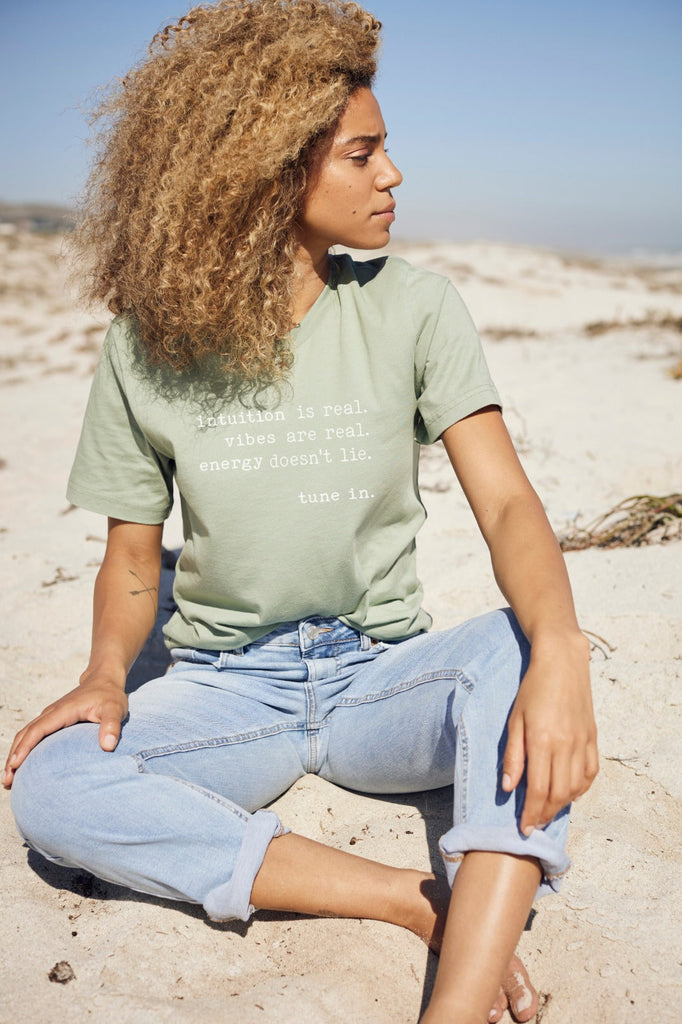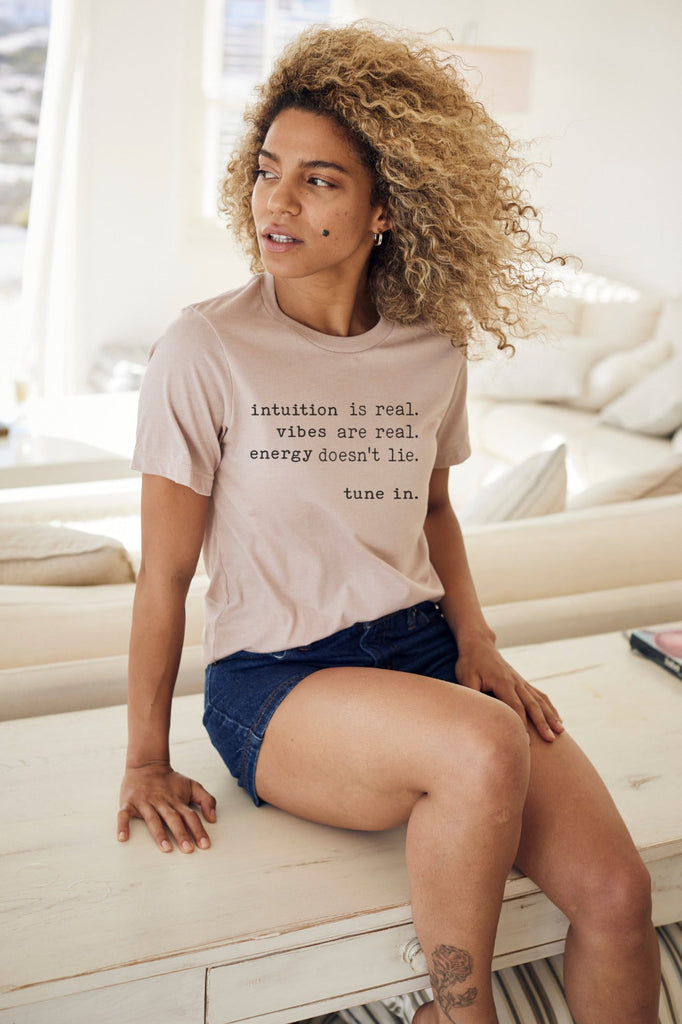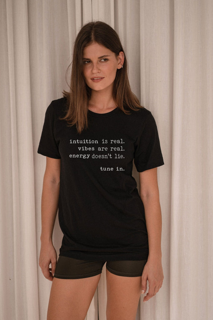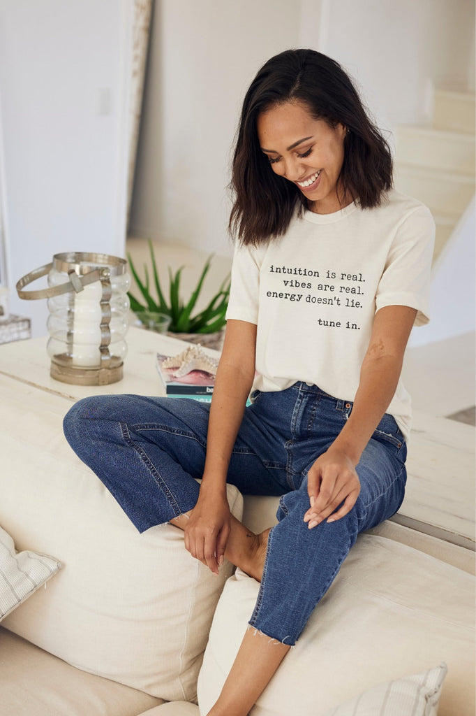 Our "Intuition Is Real" Short Sleeve Tee is close to our hearts and will always remain a staple in your wardrobe all year round. Featuring a crew neckline, breezy sleeves, and a relaxed shape. We love effortlessly throwing this on in a morning, simple, heartfelt, comfortable.